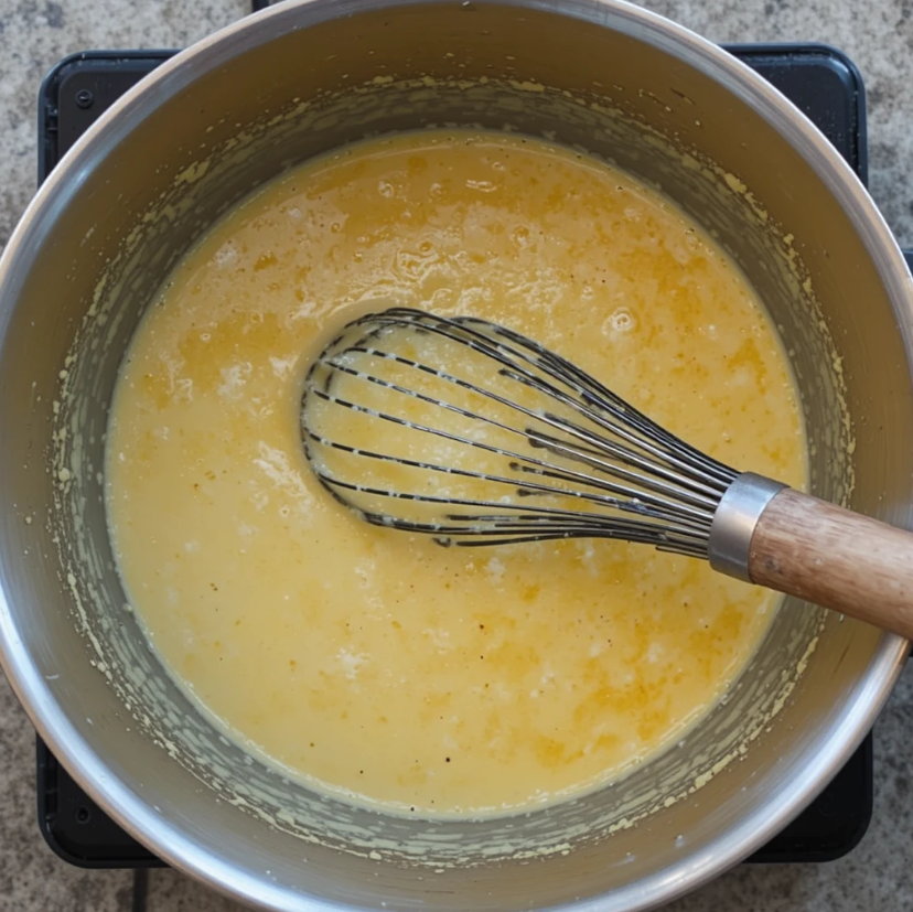 - Whisk in the heavy cream and milk until the mixture is smooth.