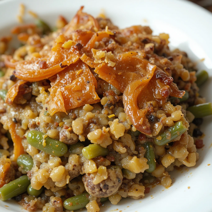 This isn’t your average side dish. By adding savory ground beef (hamburger), we transform this traditional Thanksgiving or holiday side into a complete, budget-friendly, one-dish meal that your whole family will request on a regular weeknight. Imagine tender green beans and savory ground beef smothered in a creamy, homemade mushroom sauce, all topped with that iconic golden, crispy fried onion crunch. It’s a symphony of textures and flavors that is both nostalgic and excitingly new.